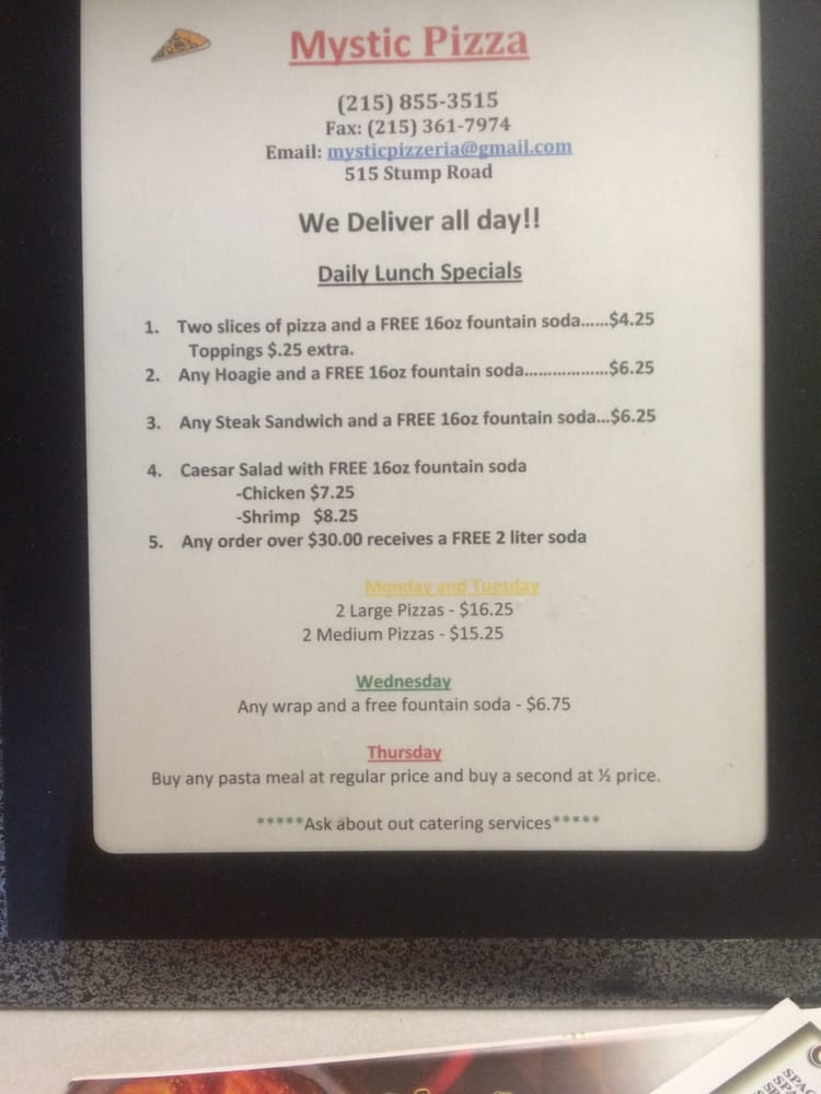 Welcome to Mystic Restaurant, a charming pizza haven located at 515 Stump Rd, Montgomeryville, PA. This local gem is praised for its delicious offerings and friendly service, making it the perfect spot for a casual lunch or dinner. The menu features a variety of mouthwatering options, from their famous wings to perfectly crafted pizzas, all made in-house with fresh ingredients.